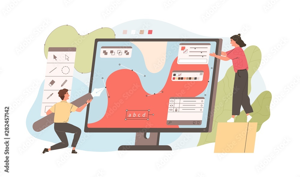 Pair Of Funny Young Man And Woman Drawing With Pen In Graphic Editor Cute Digital Designers Or Illustrators Working Together On Giant Computer Display Flat Cartoon Colorful Vector Illustration Stock Vector